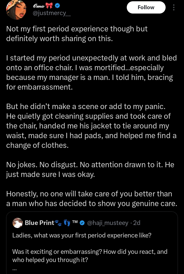 A post on X by @justmercy__ has gone viral after she shared a personal workplace experience involving an unexpected period incident and how her manager responded.
