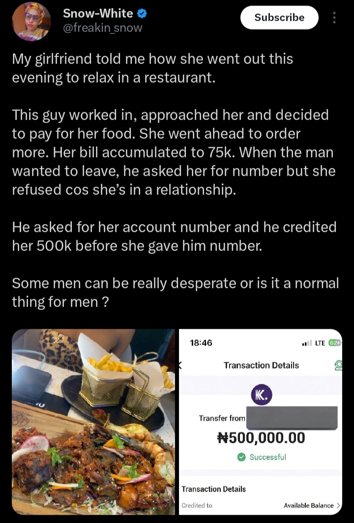 When the man asked for her phone number, she politely refused, explaining that she was in a relationship. Surprisingly, he then asked for her bank account details and credited her 500,000 Naira before she gave him her number.