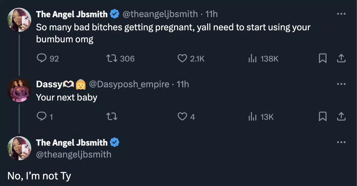 When a fan speculated in the comments section that Angel might be the next to reveal she was pregnant, she quickly replied, “No, I am not Ty.”