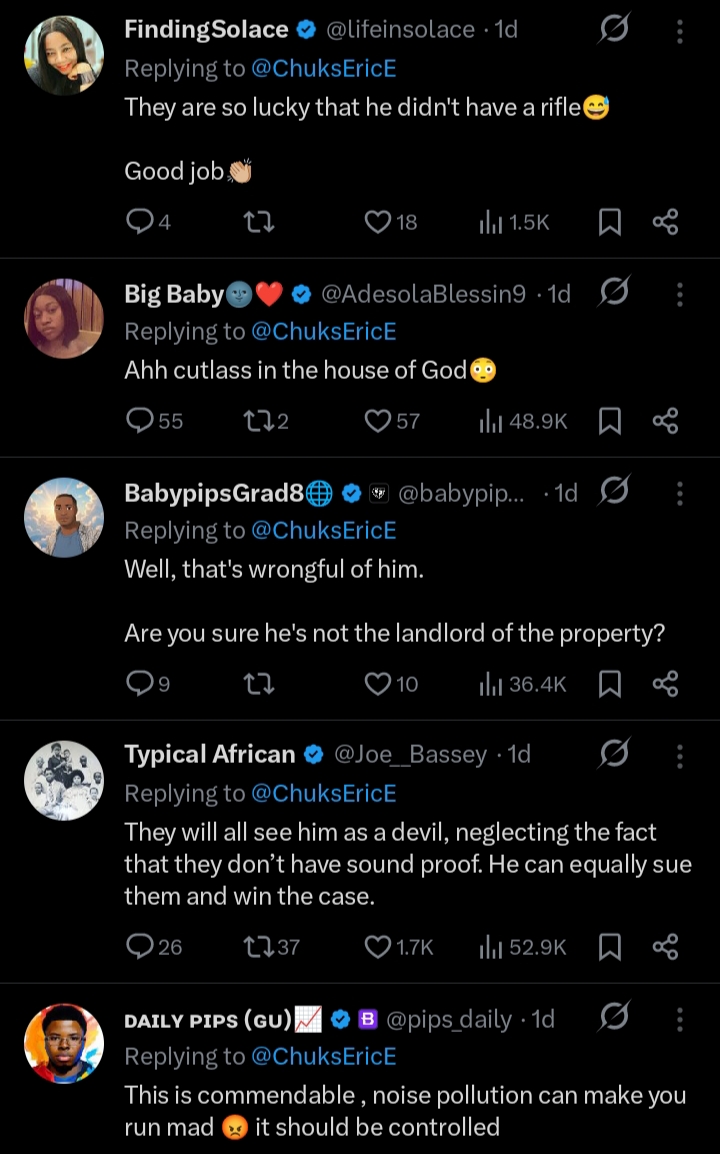 The event has sparked widespread reactions online, with Nigerians condemning the man’s actions and emphasizing the need for peaceful resolution of disputes. Some commentators noted that while residents have a right to peace and quiet, resorting to violence and wielding a weapon is unacceptable.