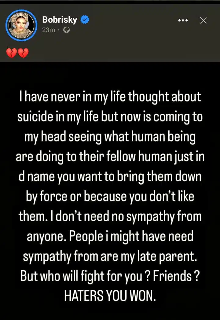 His post reads, “I’ve never considered suicide in my life, but now it’s crossing my mind seeing how humans treat their fellow housemates, just to bring them down by force or because they refuse to lift them up. I don’t need sympathy from anyone. The people I wish could sympathize with me are my late parents, but who will fight for you? Friends? Haters, you have won”.