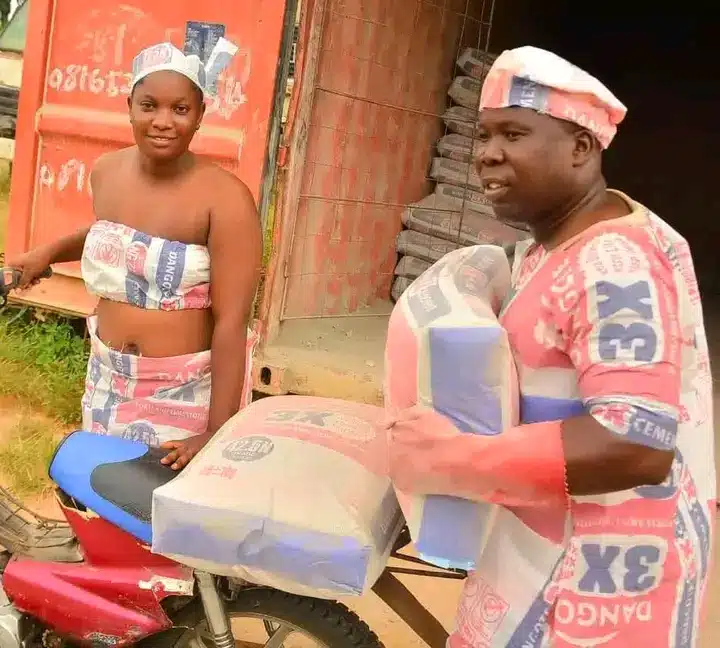 The post included pictures of the two wearing outfits with a Dangote cement theme.