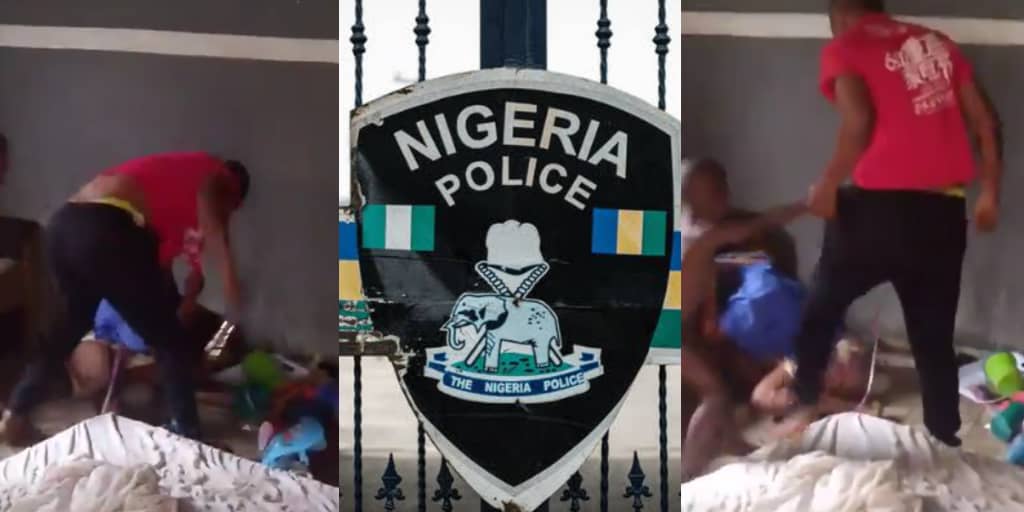 A Nigerian police officer has been caught on camera assaulting his wife while their children watched in tears, pleading with him to stop.