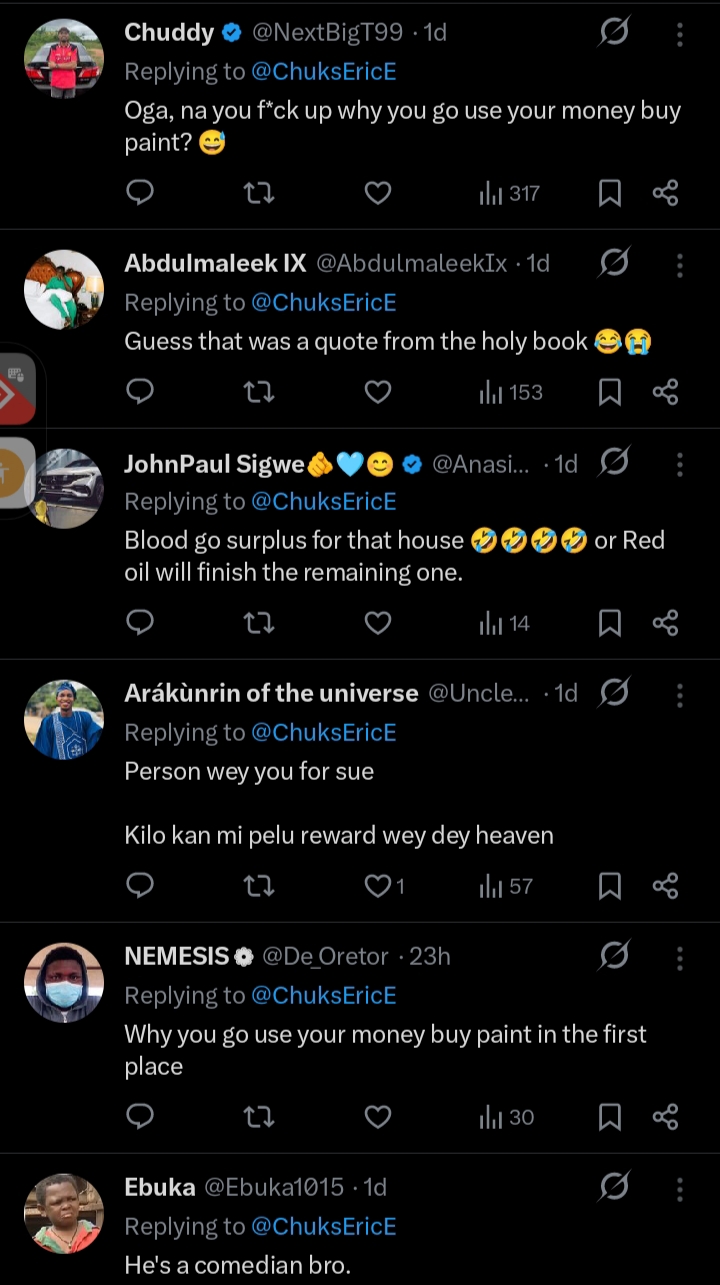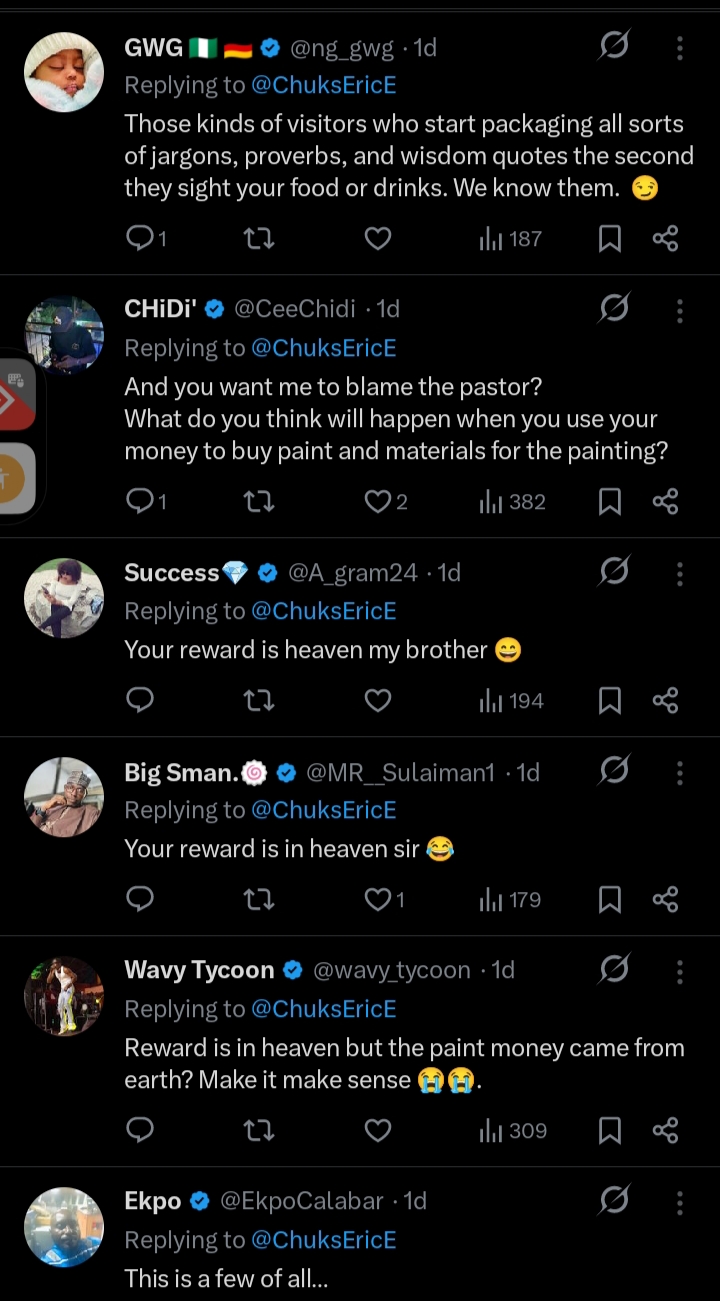 “Pastor say make I come paint him house, I use my money go paint pastor house. After I finished painting his house, I came and met pastor so he can pay me my money. Pastor said my reward is in heaven. I called pastor Emma, na heaven I paint or your own house? Upon say na my money I use buy paint. The pastor wey talk say our reward dey heaven stand for earth, but he buy 30 hectares of land.”
