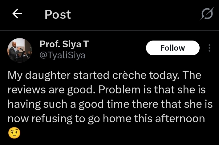 “My daughter started crèche today. The reviews are good. Problem is that she is having such a good time there that she is now refusing to go home this afternoon,” he tweeted.