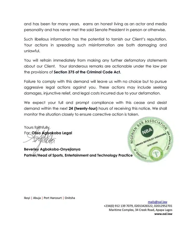 The letter claims that the contentious blog was told to remove Dakore’s picture and apologize for any disparaging remarks made about her.