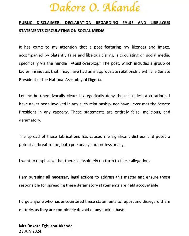 Actress Dakore Egbuson Akande of Nollywood files a lawsuit against the Gistlover blog due to false allegations that she is Godswill Akpabio’s side chick.