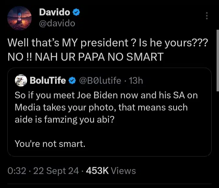 “Well that’s MY president ? Is he yours??? NO !! NAH UR PAPA NO SMART,” Davido wrote.