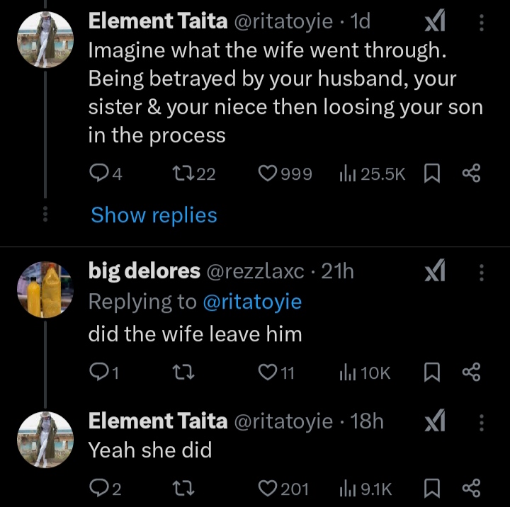 Imagine what the wife went through. Being betrayed by your husband, your sister & your niece then loosing your son in the process”