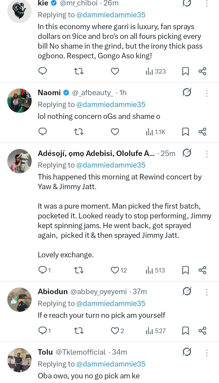 Instead of security personnel or aides stepping in to gather the sprayed money, 9ice was seen personally bending down to pick up the dollar bills himself, drawing laughter and mixed reactions from fans both at the venue and online.