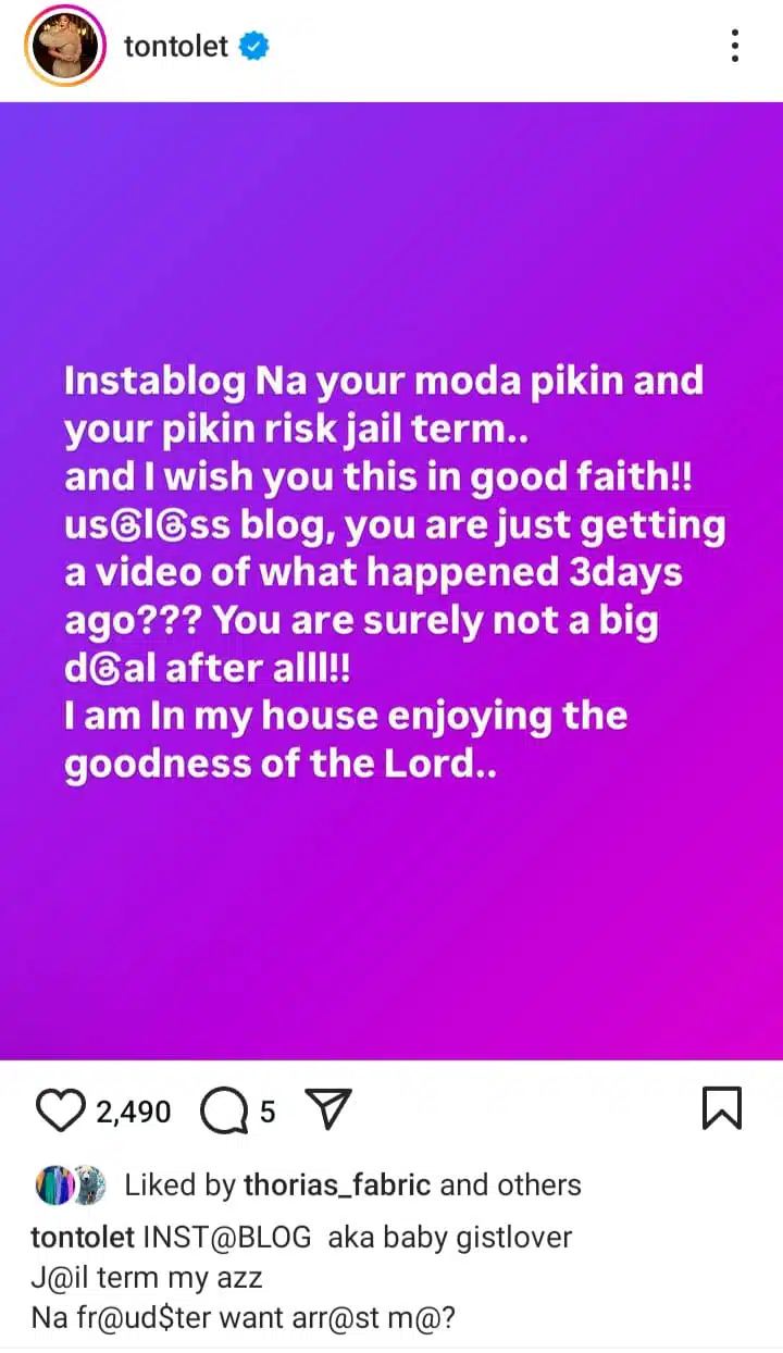 “instablog Na your moda pikin and your pikin risk jail term.. and I wish you this in good faith!! useless blog, you are just getting a video of what happened 3days ago??? You are surel not a big deal after all!! I am in my house enjoying the goodness of the Lord.”