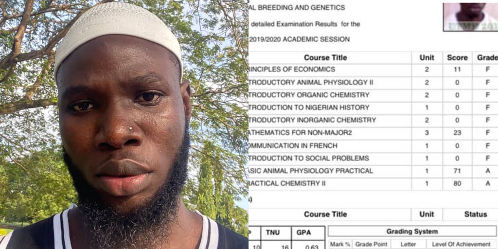 A final year student of the Federal University of Agriculture, Abeokuta (FUNAAB), has sparked widespread reactions online after sharing his 100-level second semester result, which showed 8 Fs and 2 As.