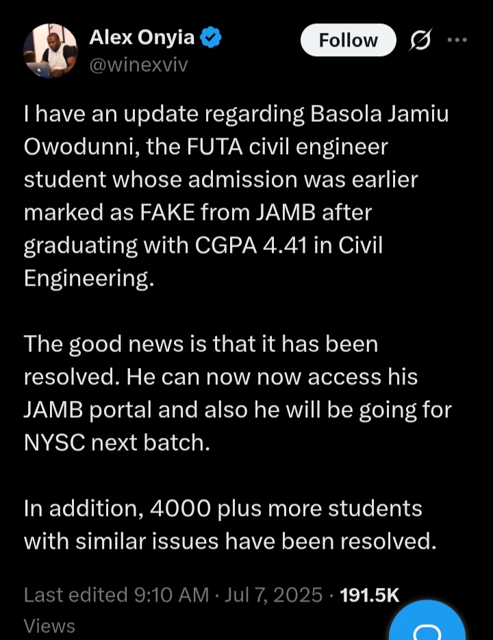 “I have an update regarding Basola Jamiu Owodunni, the FUTA civil engineer student whose admission was earlier marked as FAKE from JAMB after graduating with CGPA 4.41 in Civil Engineering.