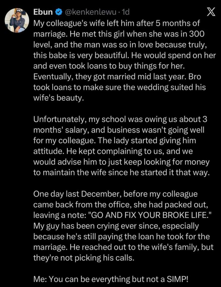 According to a viral post on X (formerly Twitter) shared by his colleague, Ebun, the man first met his wife when she was in 300 level. He fell deeply in love with her, drawn not only to her beauty but also to the life he envisioned together. Determined to give her the best, he spared no expense, even taking loans to fund her lifestyle.