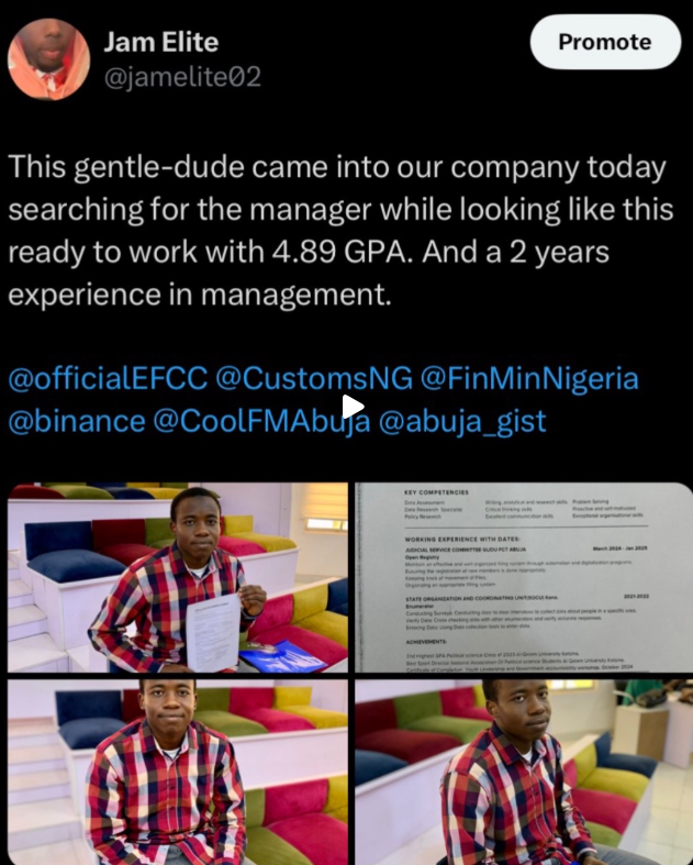 A young Nigerian graduate, Abdullahi Muhammad Ahmad, has gained attention on social media for his bold approach to job hunting after storming a company uninvited.