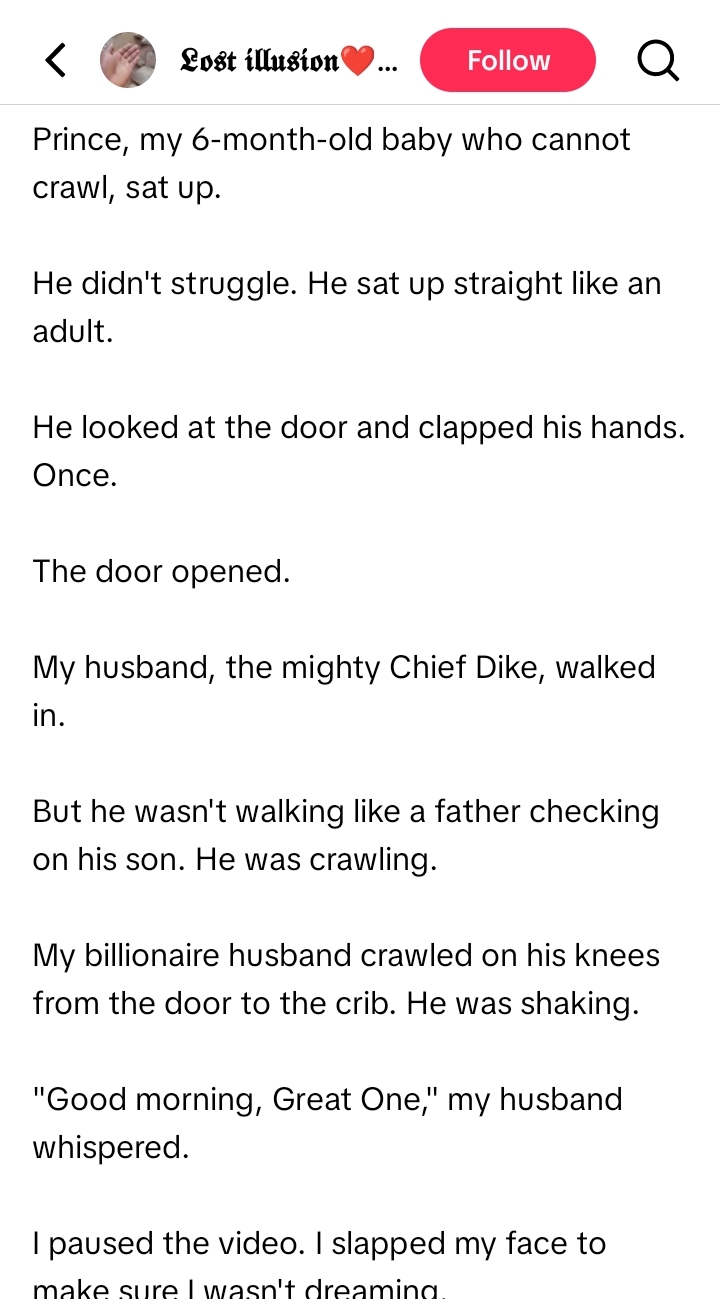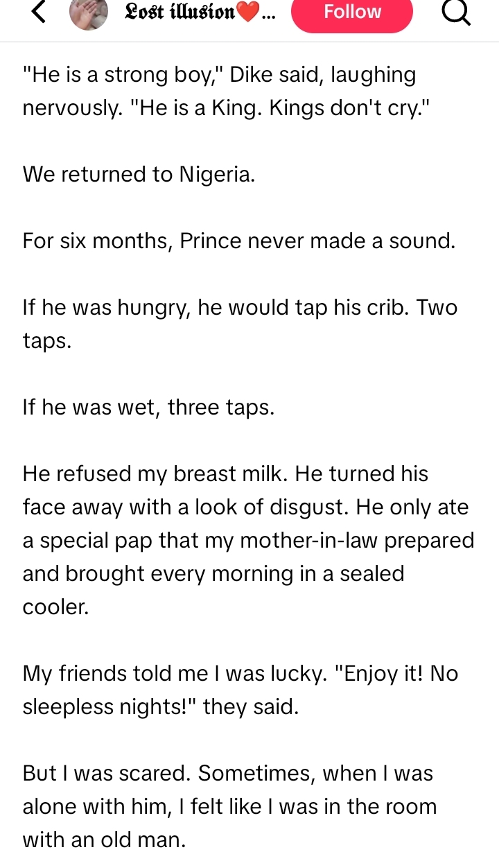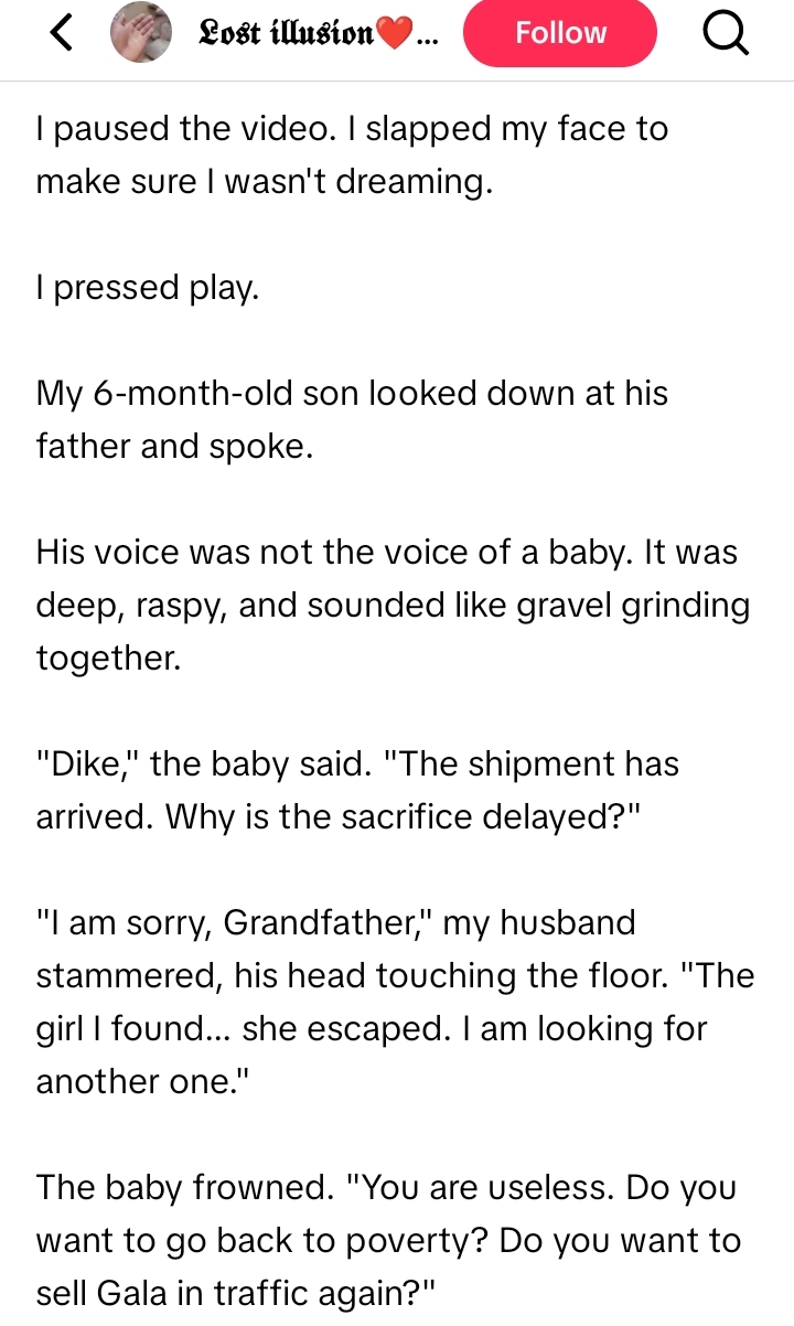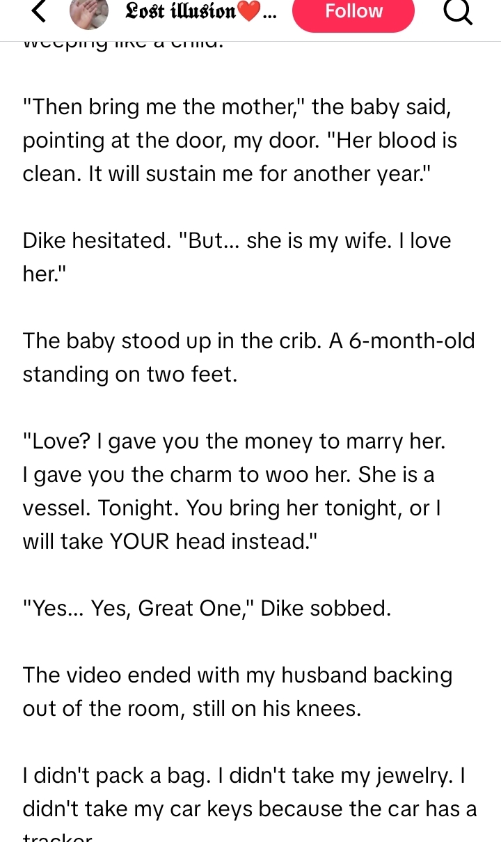 The woman shared that the 6‑month‑old baby had a conversation with her husband, who revealed that the lady meant for the sacrifice had escaped.