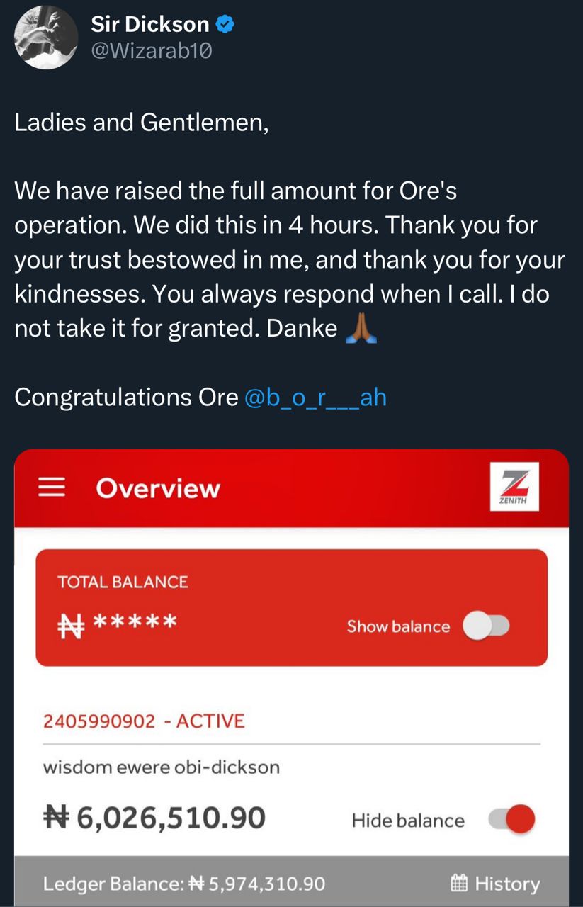 Moved by her story, Sir Dickson, via his X handle @Wizarab10, rallied his followers to help raise the estimated N5.7 million required for the surgery.