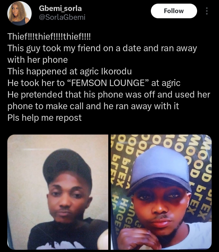 A lady has taken to social media to call out a man who allegedly stole her friend’s phone during a date in Ikorodu, Lagos State.