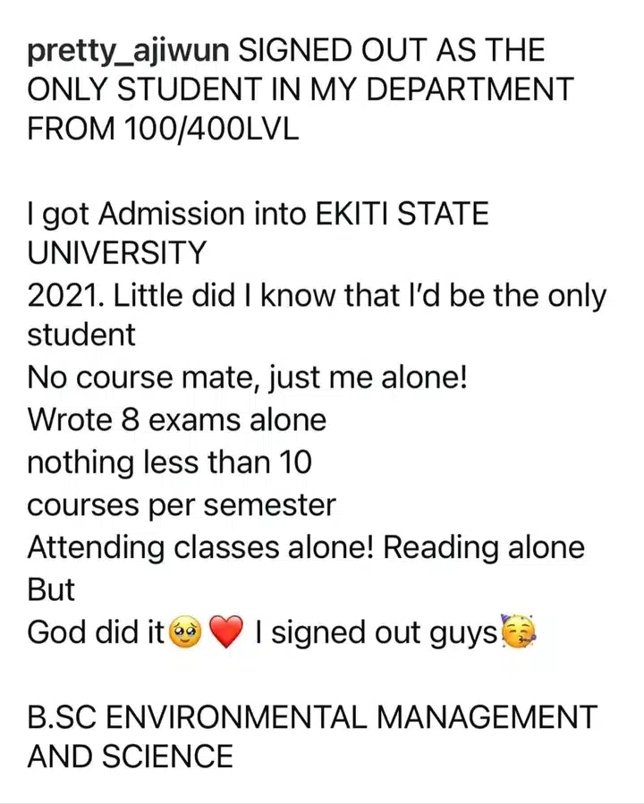 Attending classes alone, reading alone but God did it. I signed out guys. B.S.C environmental management and science.