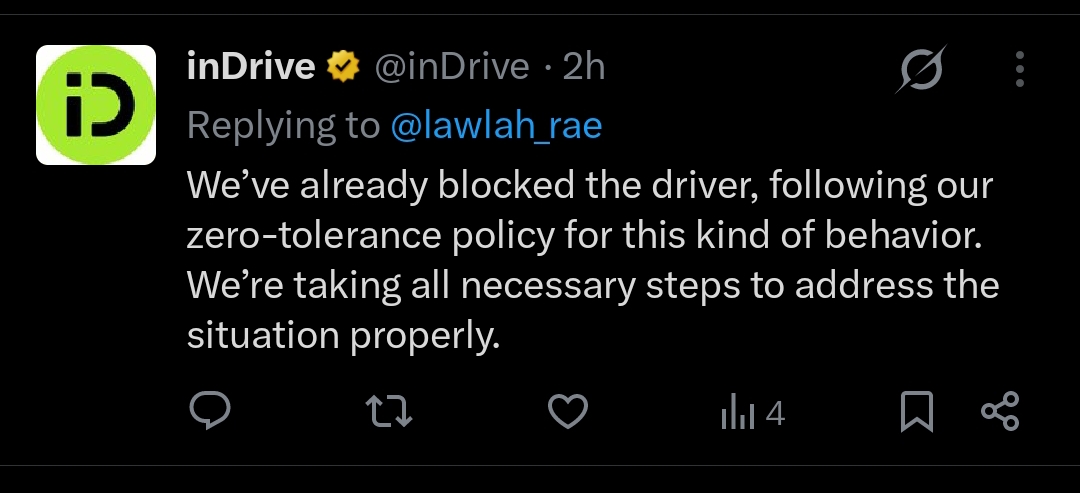 Following her report, the inDrive team responded and confirmed that the said driver has been blocked from the platform.