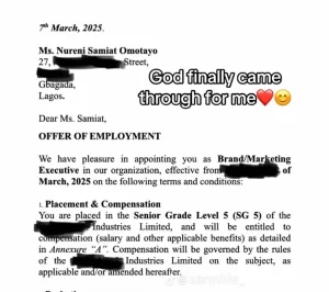 “After four months of being jobless after NYSC, God finally came through for me”.