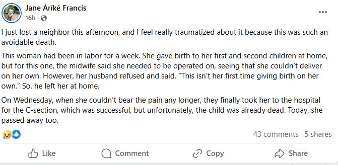 A Facebook user named Jane Àríké Francis shared the incident and disclosed that the deceased was his neighbor.