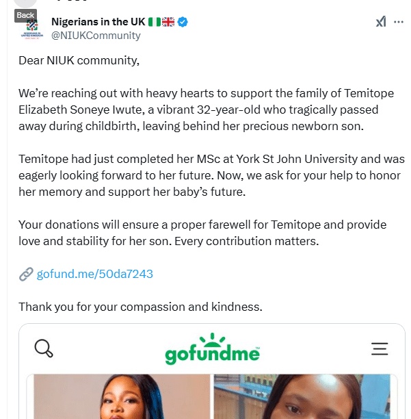 “Temitope was vibrant and full of life, looking forward to her journey as a mother, her d+ath is a devastating loss to her family, friends, and the community,” the community shared.