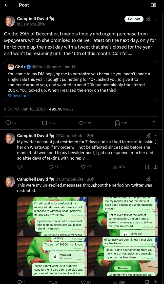 In his post, the man wrote: “On December 29th, I made an urgent purchase from @ps_wears, which she promised to deliver by the next day. The following day, however, she tweeted that she was closed for the year and wouldn’t resume until the 16th of the following month.”
