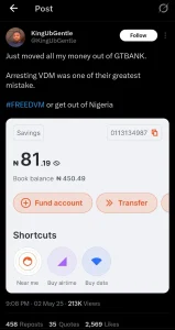 “Just moved all my money out of GTBank. Arresting VDM was one of their greatest mistakes. #FreeVDM or get out of Nigeria.”