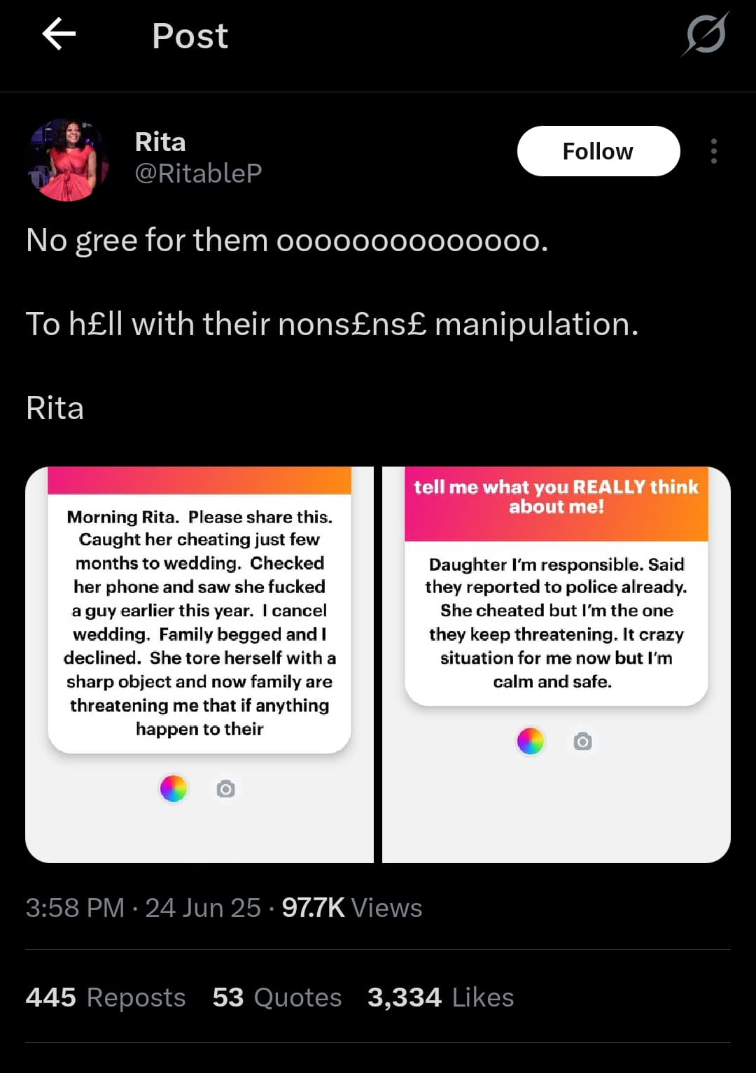 In his words: “Morning Rita. Please share this. Caught her cheating just few months to wedding. Checked her phone and saw she fucked a guy earlier this year. I cancel wedding. Family begged and I declined.”