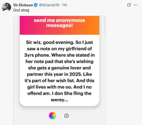“Sir Wiz, good evening. I just saw a note on my girlfriend of 3 yrs phone. Where she stated in her note pad that she’s wishing she gets a genuine lover and partner in 2025. Like it’s part of her wish list. And this girl lives with me oo. And I no offend am. I don sha fling the werey.”