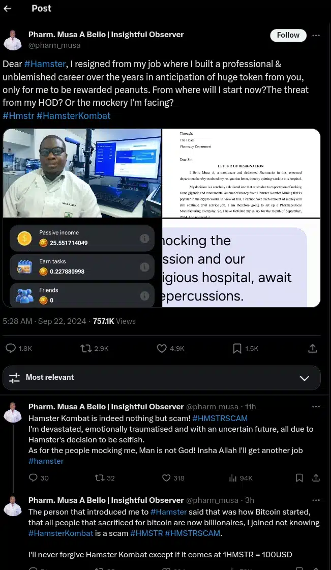 “Where do I start now? The threats from my HOD? Or the mockery I’m facing? Hamster Kombat is indeed nothing but a scam! #HMSTRSCAM.”