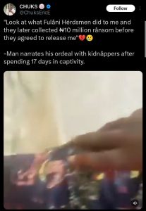 A Nigerian man has shared his harrowing 17-day ordeal in the captivity of Fulani herdsmen, revealing he was forced to pay a ₦10 million ransom for his release.