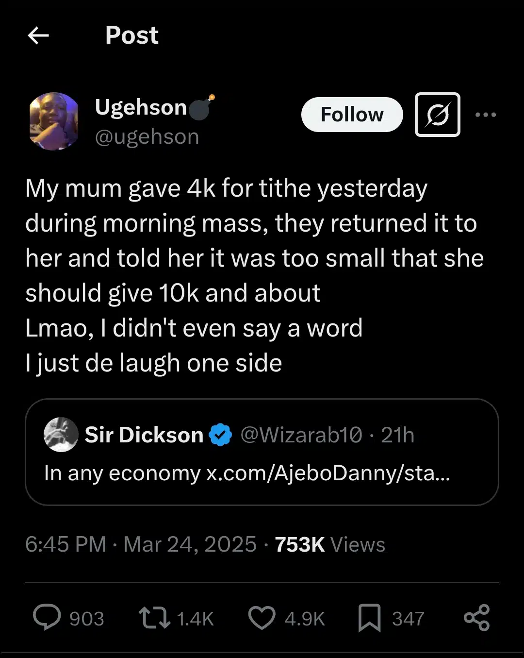 His post read: “My mum gave ₦4k for tithe yesterday during morning mass. They returned it to her and told her it was too small, that she should give ₦10k and above. Lmao, I didn’t even say a word. I just de laugh one side.”