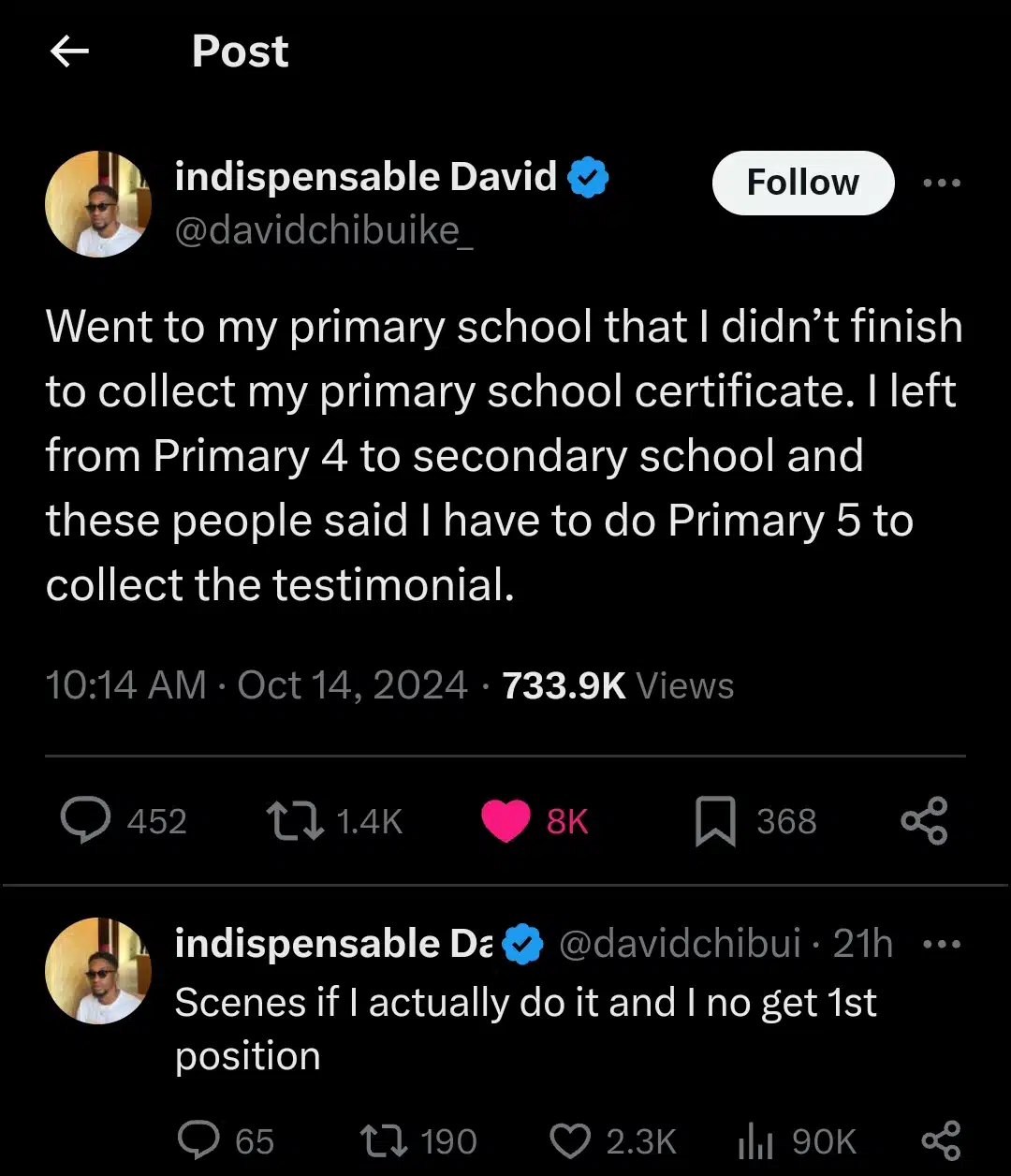 A Nigerian man has sparked reactions on social media after sharing his experience of visiting his former primary school, where he left in Primary 4, to request his primary school certificate.