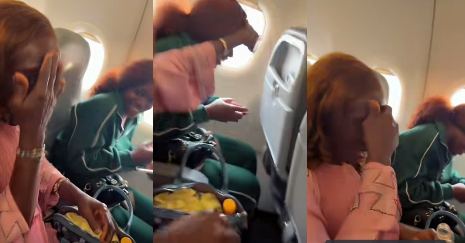 In the now‑viral TikTok video, the lady is spotted sitting next to her mother in the plane, who drinks the anointing oil and rubs it on her forehead.