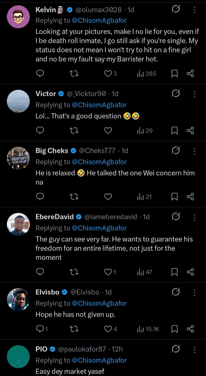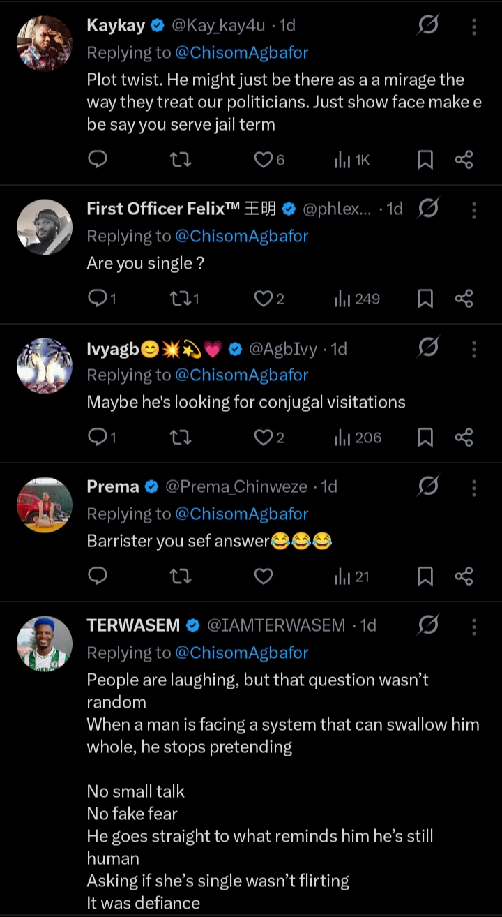 A Nigerian lawyer, @ChisomAgbafor, has sparked reactions online after sharing an unexpected experience during a visit to Kirikiri Correctional Centre in Lagos.