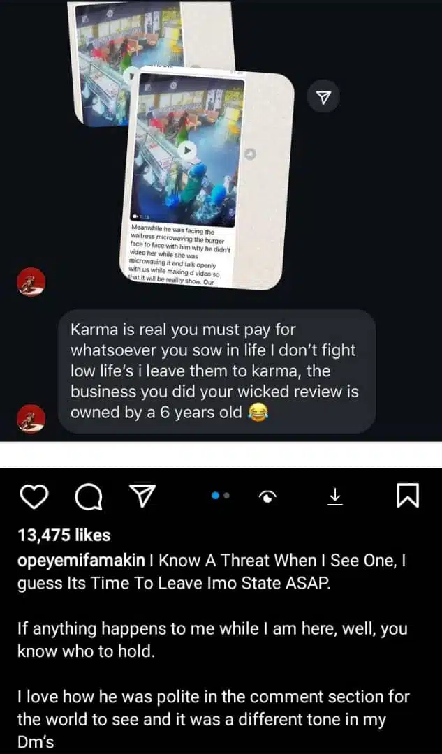 The food critic wrote: “I Know A Threat When I See One, I guess Its Time To Leave Imo State ASAP. If anything happens to me while I am here, well, you know who to hold. I love how he was polite in the comment section for the world to see and it was a different tone in my Dm’s”