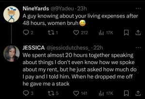 User @jessicdutchess_ took to X (formerly Twitter) to express her surprise at the unexpected kindness. The man, she claims, offered to pay her rent after a lengthy and in-depth discussion in which the subject naturally arose.