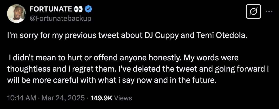 “I’m sorry for my previous tweet about DJ Cuppy and Temi Otedola. I didn’t mean to hurt or offend anyone honestly. My words were thoughtless, and I regret them. I’ve deleted the tweet and going forward I will be more careful with what I say now and in the future,” he wrote.