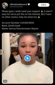 The dispute started when @barbiecuefish uploaded a video requesting donations. In her plea, she wrote: