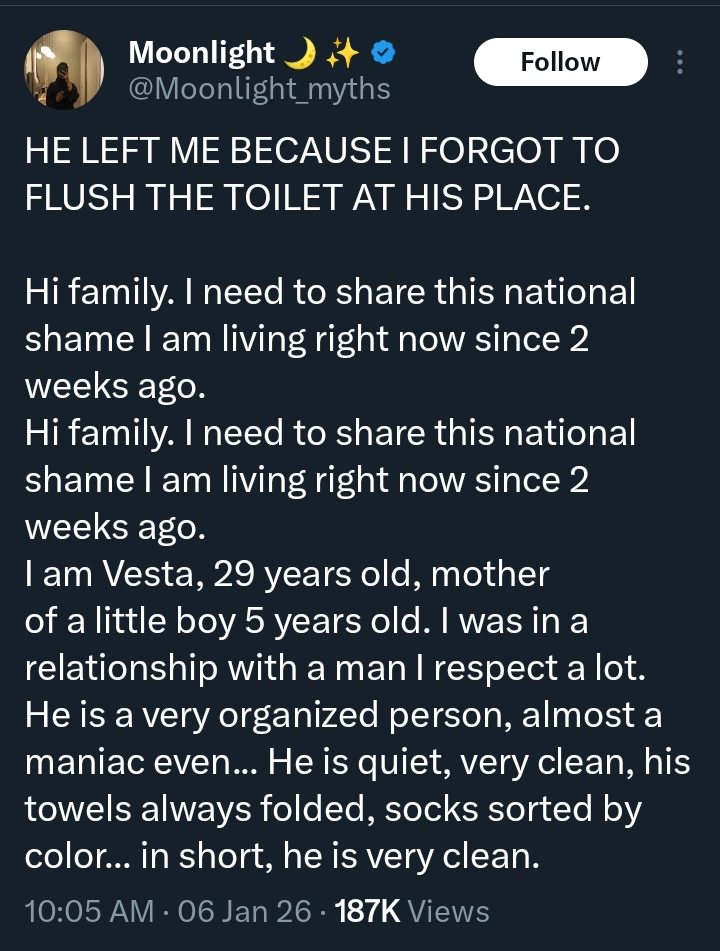 The discussion began on X (formerly Twitter) when a user identified as Moonlight shared her experience, claiming her partner ended their relationship after she forgot to flush the toilet at his house.