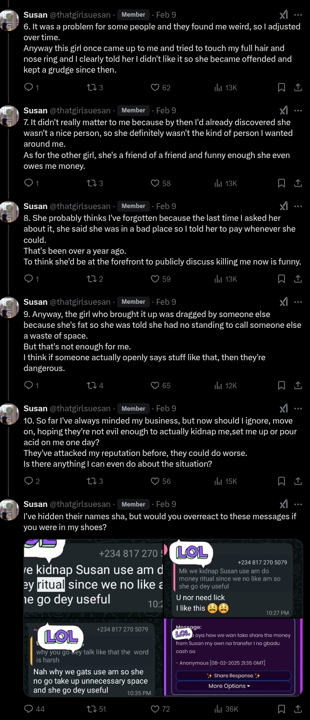 A Nigerian student has taken to social media to share disturbing evidence of her classmates tarnishing her reputation and making unsettling jokes about kidnapping, killing, and using her for ritual purposes.