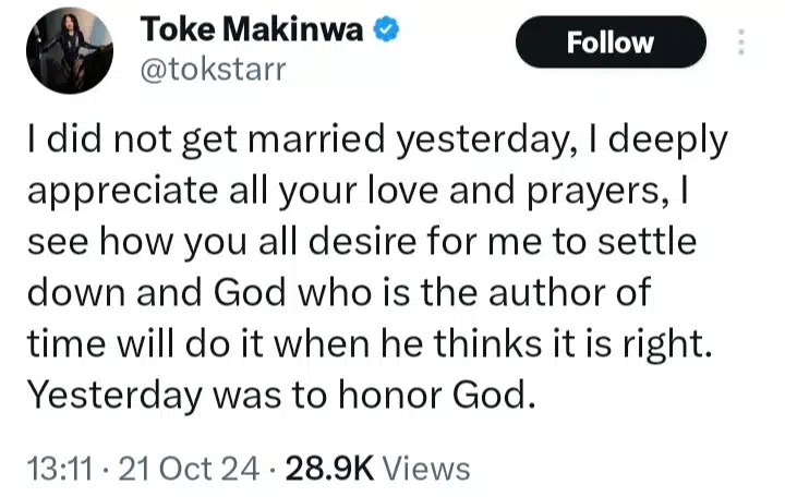 Toke Makinwa noted that she didn’t get married, thanking fans for the prayers and congratulatory messages they had sent her.