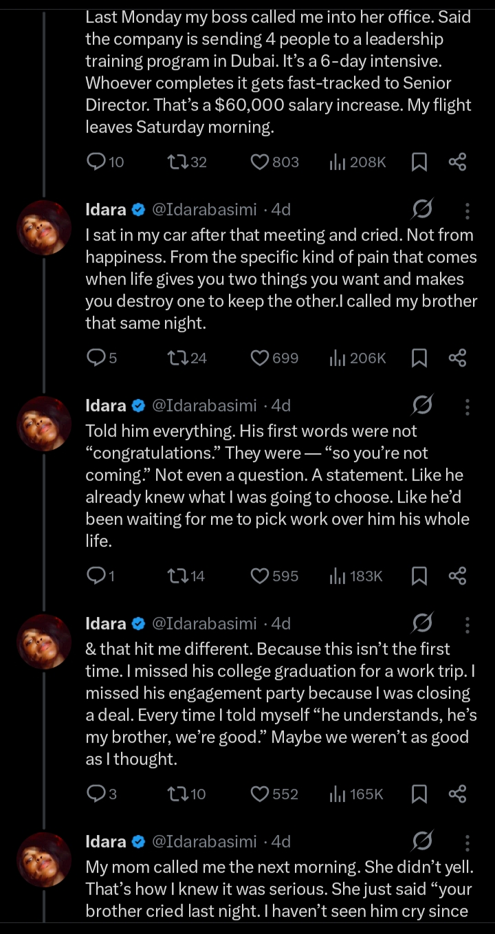 Her story has since triggered a wave of mixed reactions online, with many divided over whether family milestones should take priority over career advancement.