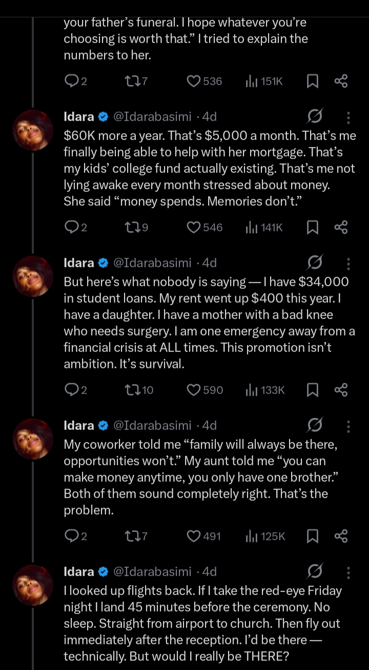 “I sat in my car and cried because this is the kind of choice where you win one thing and lose another. This promotion isn’t just ambition, it’s survival for me and my family,” she shared, pointing to her financial struggles, including student loans and family responsibilities.