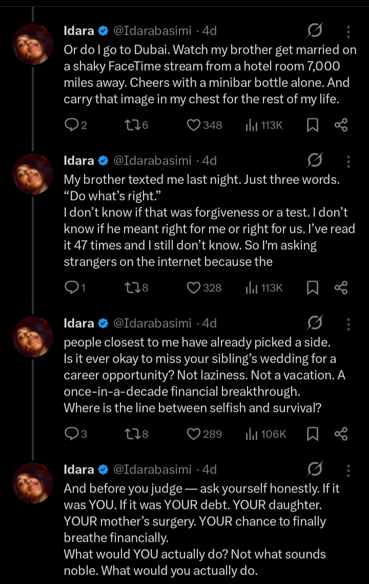 A woman has stirred widespread reactions online after opening up about her emotional struggle to choose between attending her brother’s wedding and seizing a life-changing career opportunity abroad.