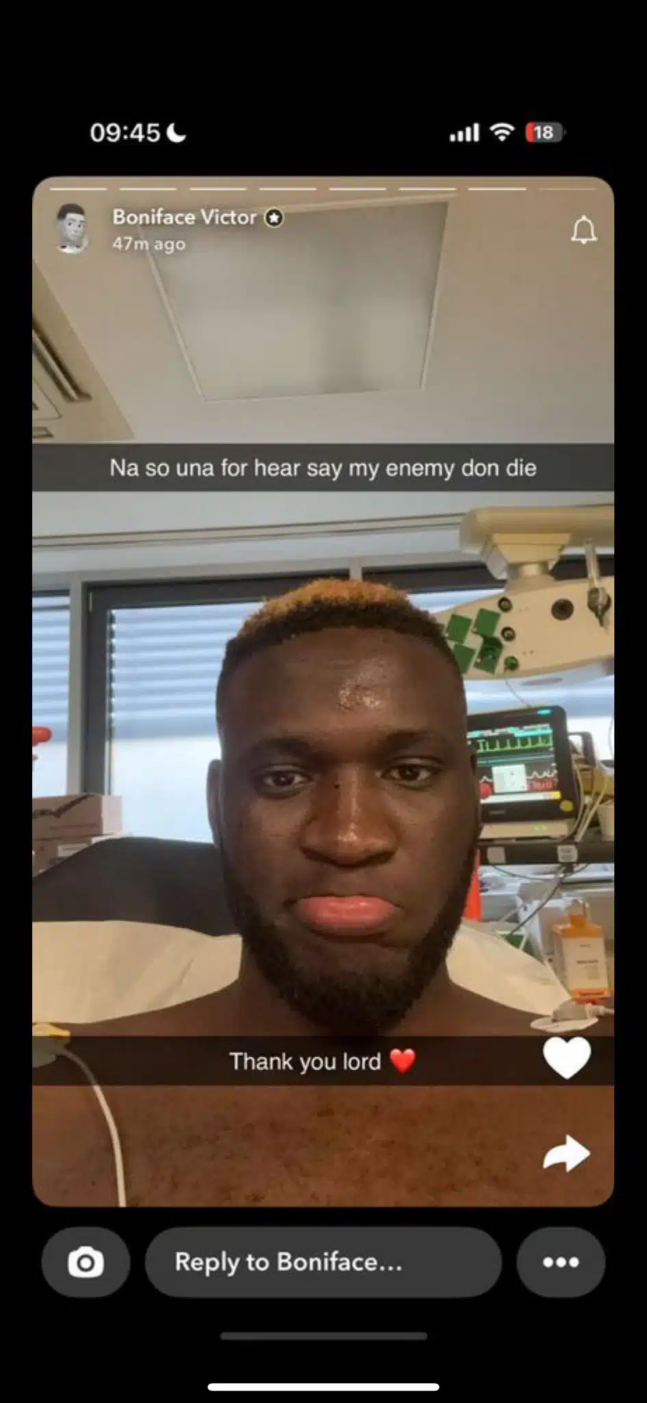 Popular Nigerian footballer, Boniface gives thanks to God for life as he survives a ghastly accident.