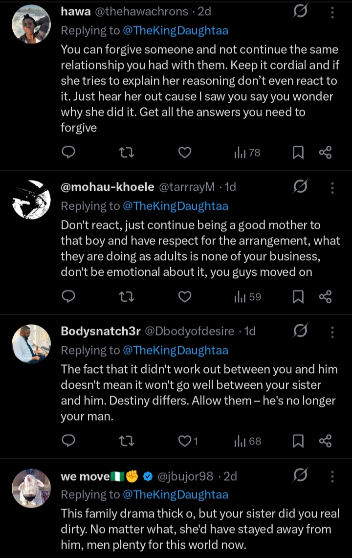 In the heat of her emotions, the mother shared that she sent harsh messages online and disclosed evidence of the relationship to family members, including their mother. She felt it was necessary to block both her sister and her ex-partner to protect her emotional wellbeing—and she has no regrets about standing up for herself.