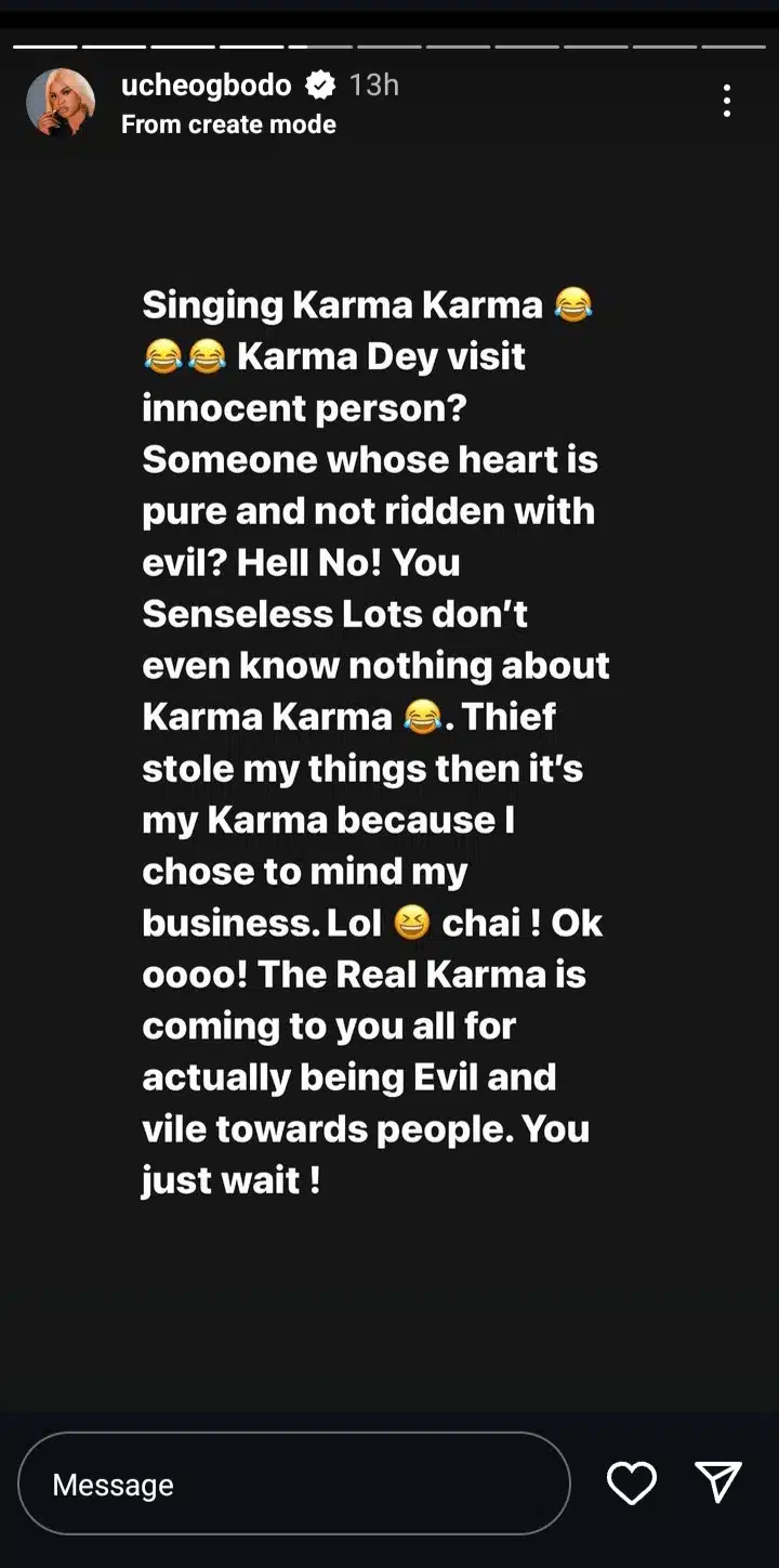 “Thief stole my goods then it’s my Karma because I chose to mind my business. The real karma is coming to you for being evil and vile towards people.